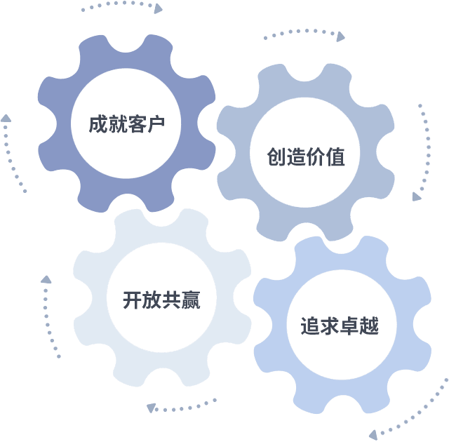 成就客户是一切决策的出发点,,创造价值是衡量所有工作的标准,,,,追求卓越是我们做事做人的态度,,开放共赢是我们的格局也是最终的结果。。价值观的齿轮环环相扣,,,推动着组织里的每个人不断向前。。。
